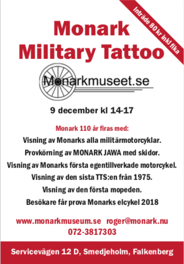 Vi firar Monark 112 år med att visa Monarks första moped samt en Unik Monark TTS Vi provstartar fordon under dagen! Vår nya cykelutställning med cyklar från 1910 - 2020